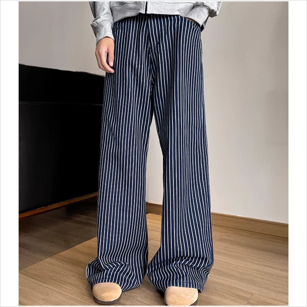ワイドシルエットとストライプ柄が魅力的なデニムパンツ。