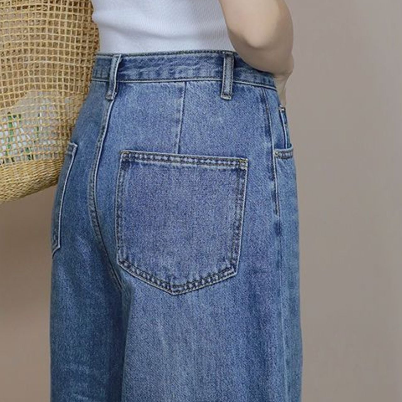 ハイウエストデザインで脚長効果も期待でき、カジュアルながらも洗練された印象を与えます。