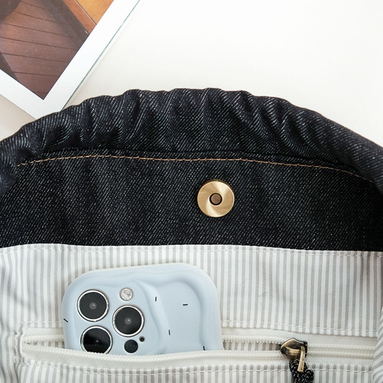 デニム素材の巾着型2WAYショルダーバッグは、普段使いに最適なアイテムです。