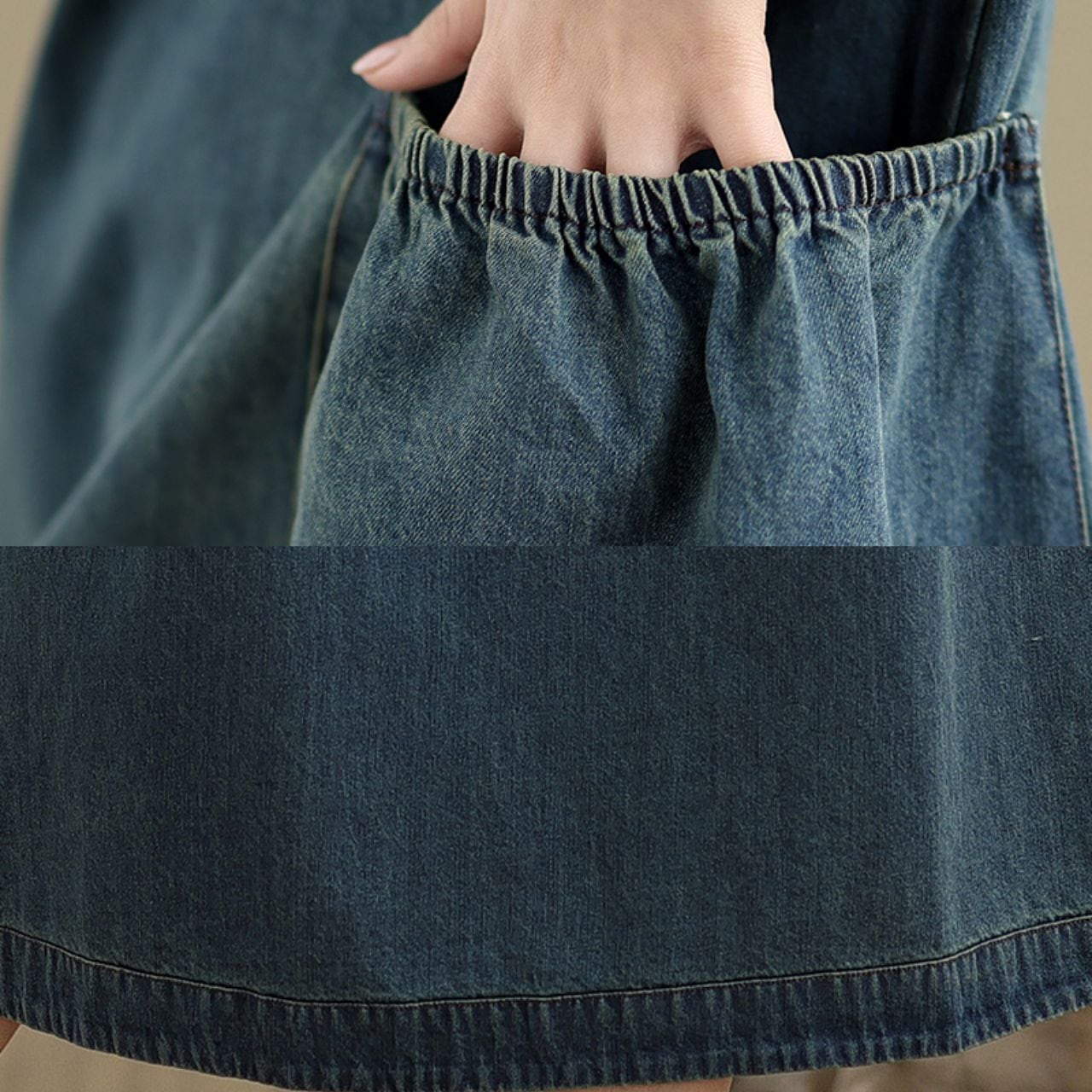 存在感のある大きめポケットがポイントのデニム風ロングワンピース。