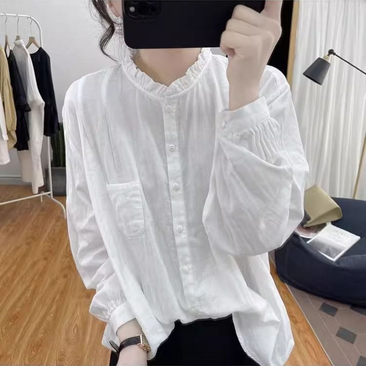 ほどよくゆったりとしたシルエットと、首元のフリルデザインが可愛いコットンライクシャツ。