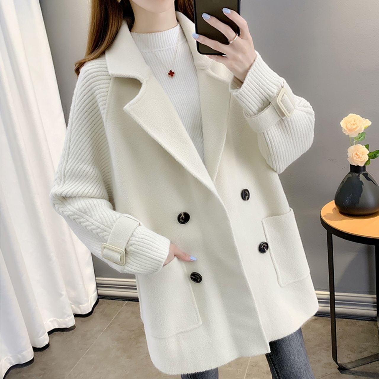 ニットと織り生地を組み合わせた切り替えデザインが目を引くダブルボタンジャケット。
