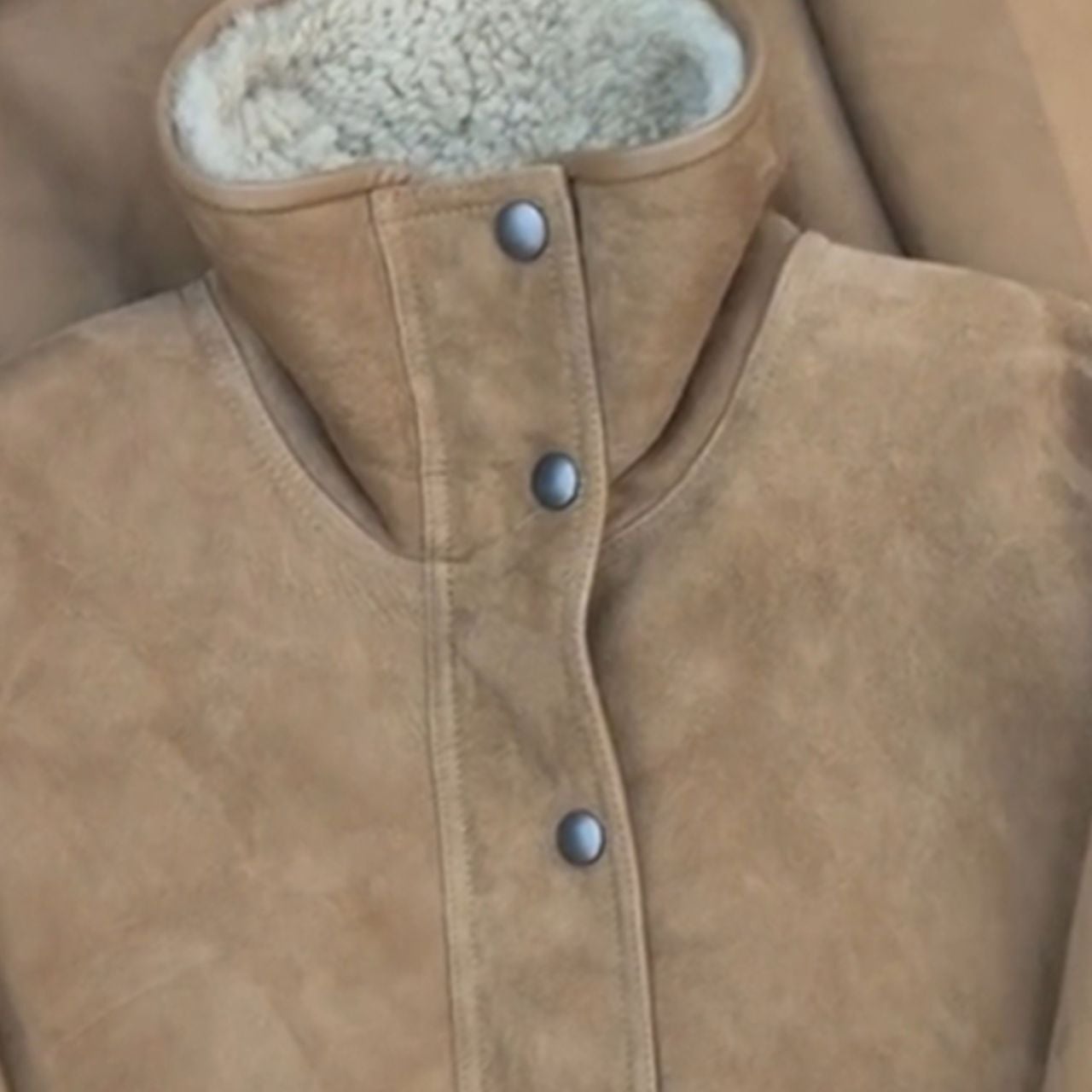 フェイクムートン風の生地に、ふわふわのボア裏地を合わせた保温性抜群の一枚です。