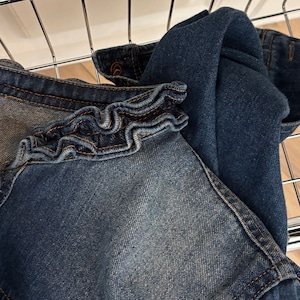 フリル調の立ち襟が印象的な、デニム風デザインのシャツトップス。