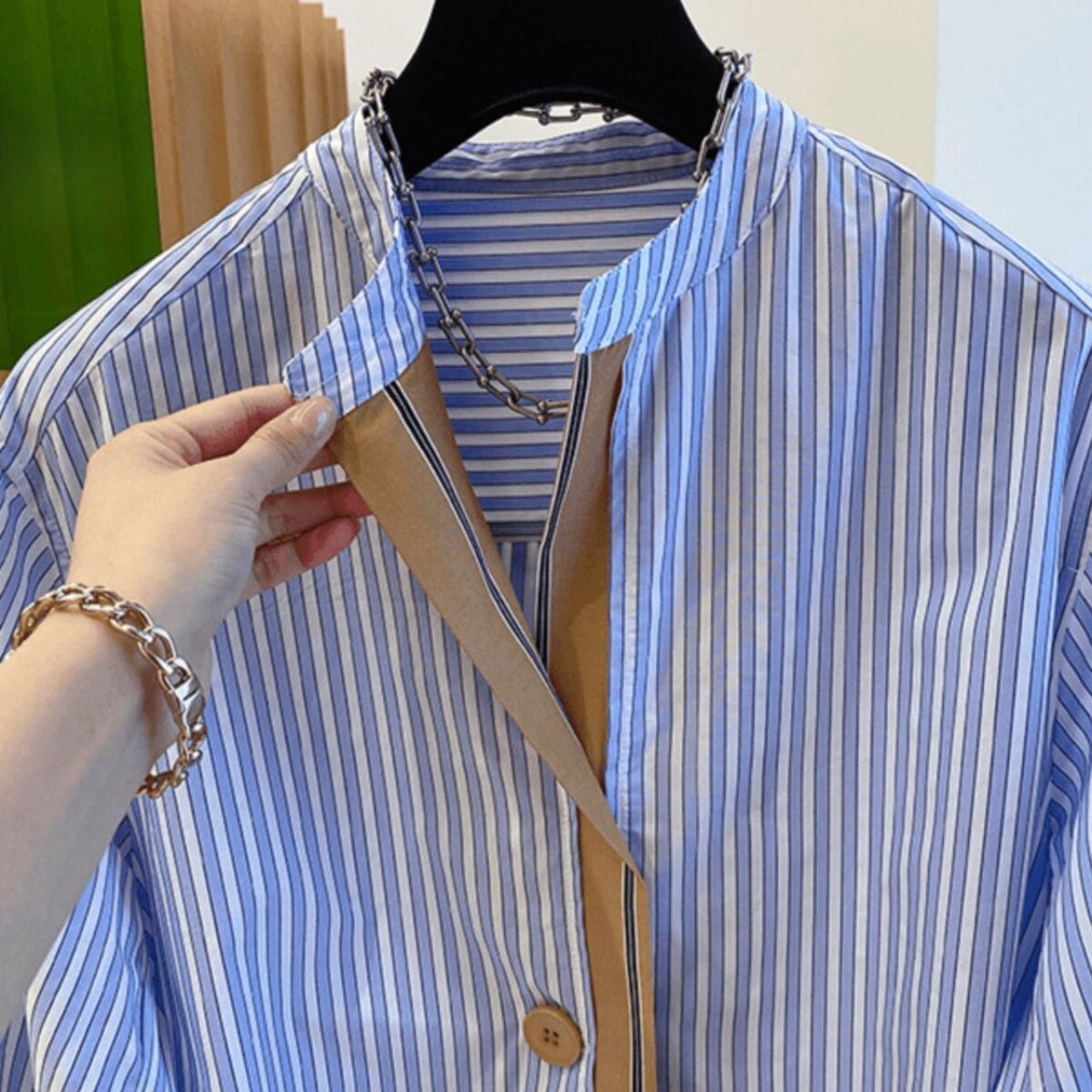 爽やかなブルーストライプに、立ち襟デザインがアクセントになった長袖シャツ。